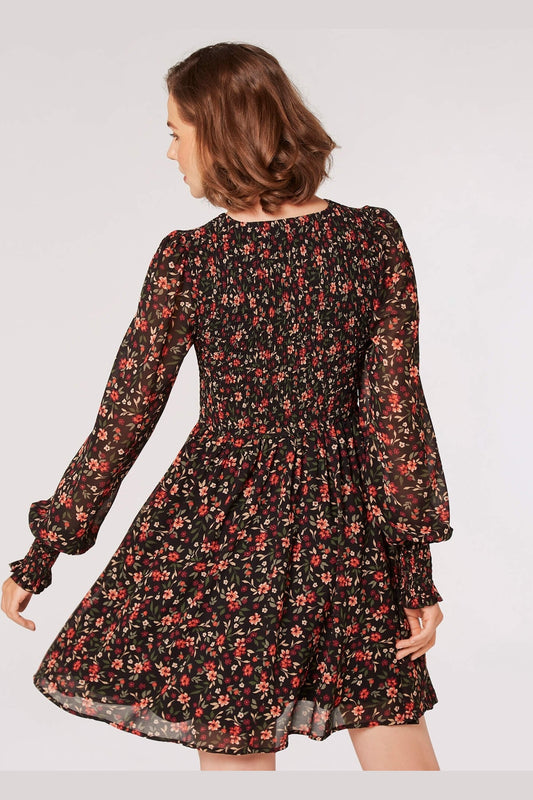 APRICOT Autumnal Ditsy Smocked Neck Dress