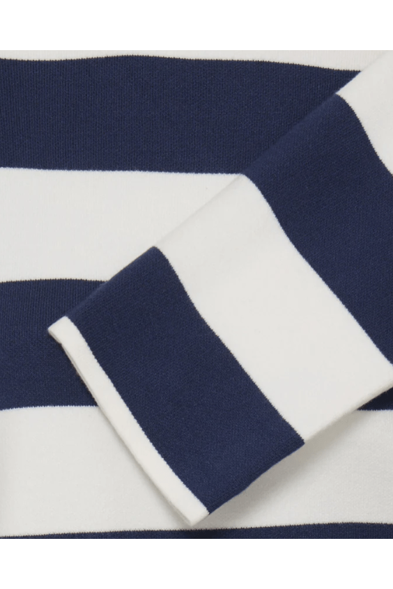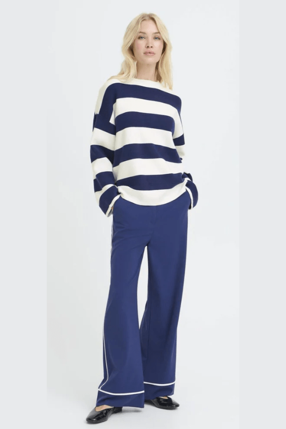 A classic stripe with a fresh, modern attitude. The Otari Striped Sweater features a relaxed silhouette with clean lines and bold navy-and-cream stripes that feel timeless without being predictable. The soft knit drapes easily, making it an ideal piece for layering now and wearing solo as the seasons shift. Polished enough for everyday errands, comfortable enough for slow weekends, this is one of those sweaters that quietly earns its place on repeat.