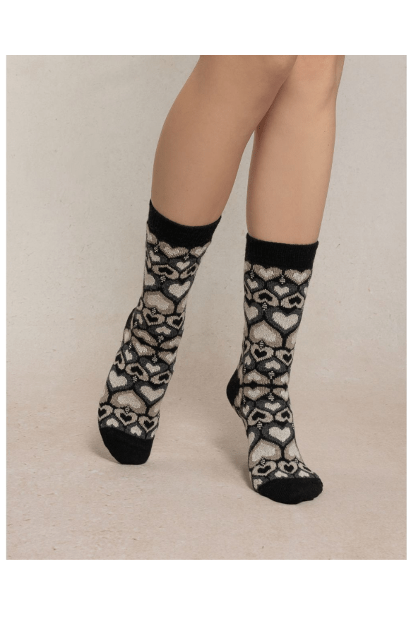 Our wool and cashmere socks , inspired by the world of sweaters, combine warmth and softness . This precious cashmere-based blend brings you all the thermal comfort of this noble material . Their discreet and timeless heart pattern adds a touch of tenderness to your winter outfits.