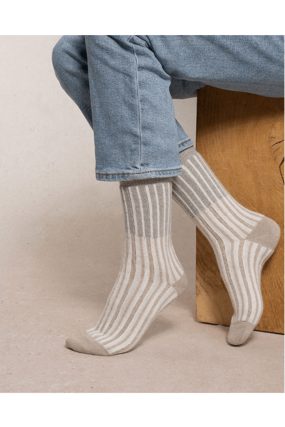 Knitted in a blend of wool and cashmere , these vertically striped socks evoke the elegance and refinement of winter knits . Their thick and soft feel guarantees optimal comfort , while the stripes bring a modern graphic touch , easy to match.