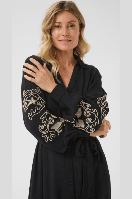 Shirt dress for women featuring a relaxed fit, button front, and belted waist. Long sleeves with embroidery add style and comfort. Ideal for versatile everyday wear or special occasions.
