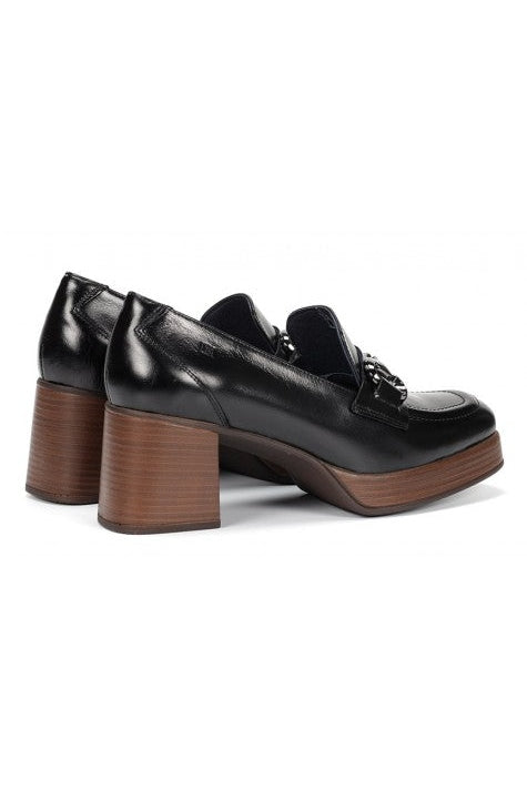 Women's shoes , fashion moccasin type, square toe, black color, from the Spanish brand Dorking . Upper in smooth shiny leather, college moccasin shape with bead on the platform and tab on the instep, highlighted with a superb silver metal bit. Navy blue lining, imitation leather, with soft and quilted first. Thick striped sole, wood style, with 2 cm front skate and large fashion heel, 6.5 cm high.
