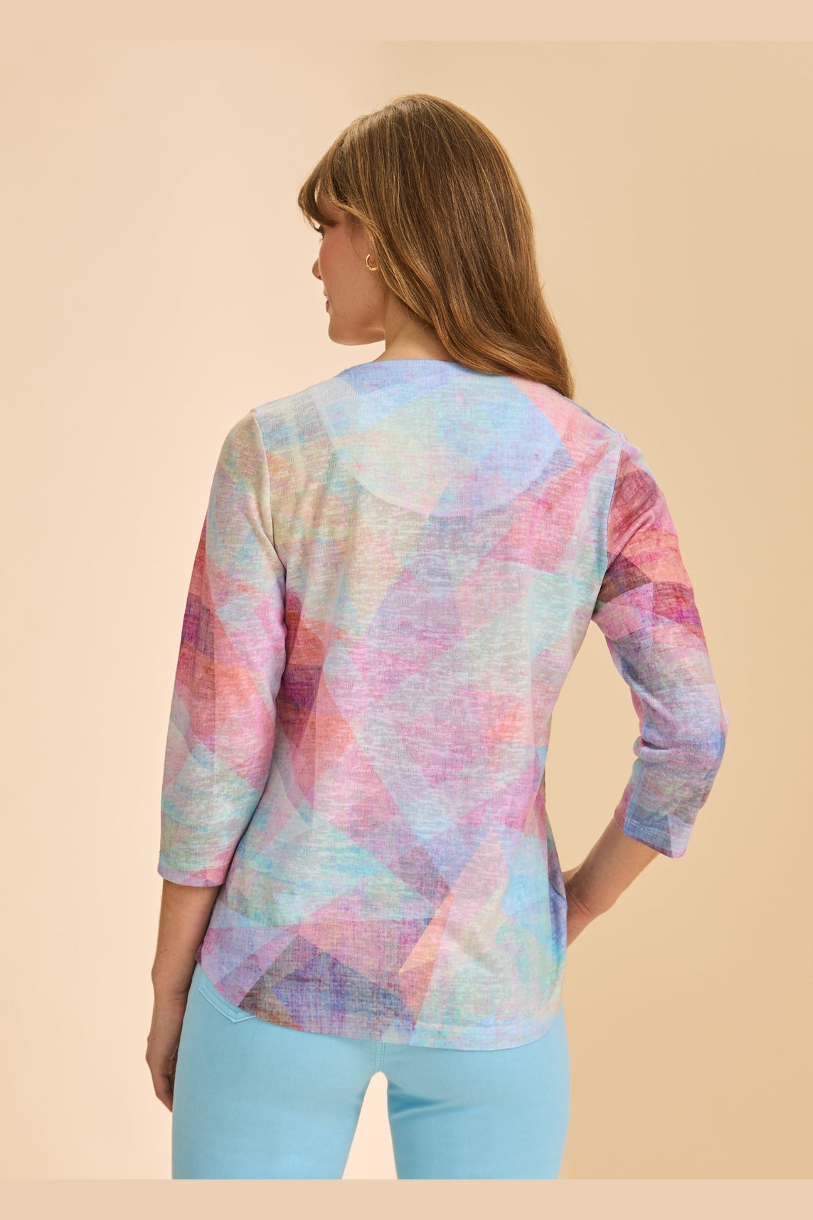 A vibrant Henley top featuring an artistic brushstroke patchwork print that adds character to any outfit. The relaxed Henley neckline and roll-tab sleeves deliver effortless style, while the lightweight, breathable fabric drapes beautifully. Perfect for pairing with denim, pants, or shorts for a polished, cheerful look.