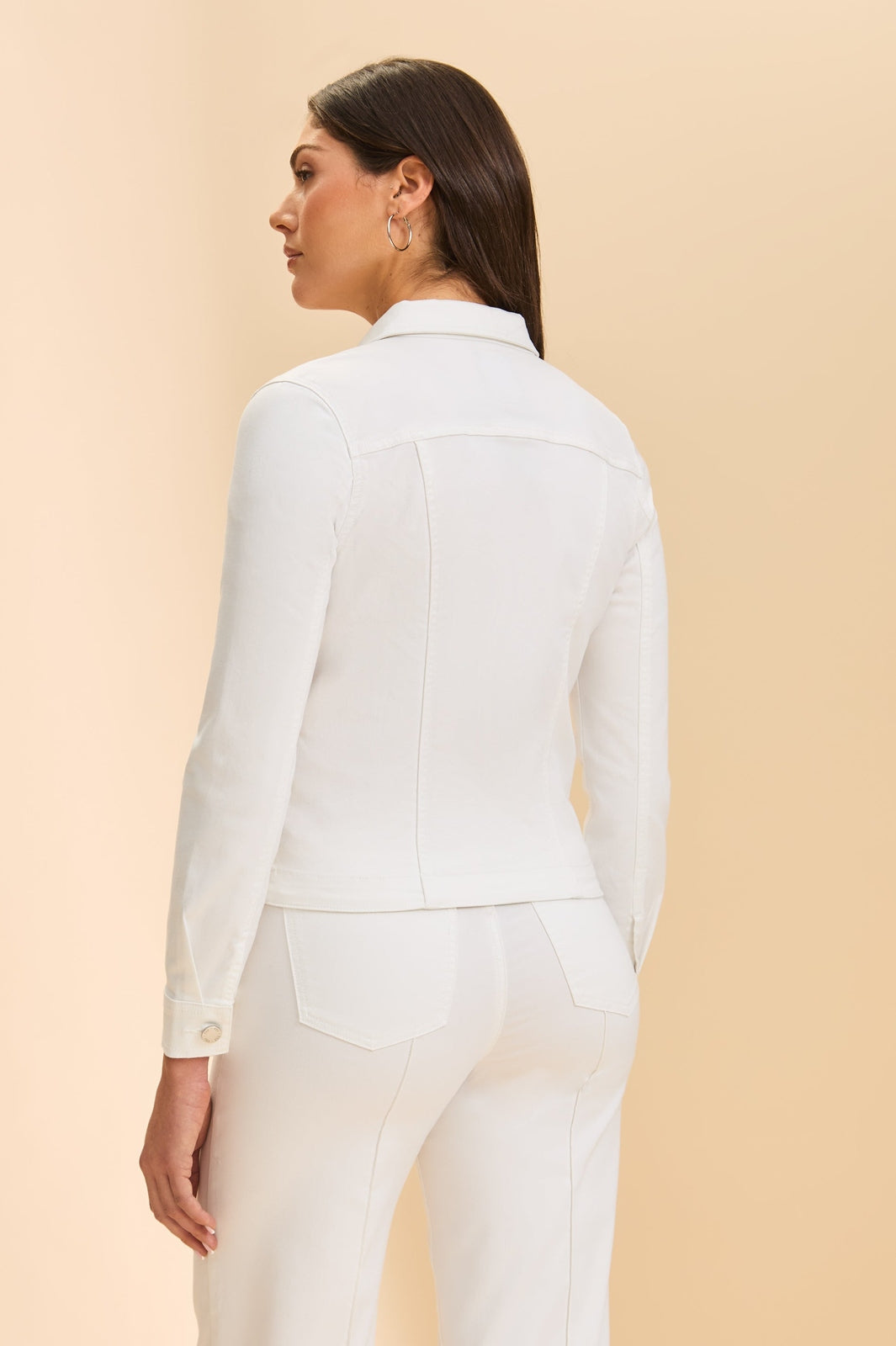 Fresh, modern, and effortlessly sleek, this denim jacket features a streamlined zip-front design and subtle contour seaming that creates a flattering, feminine silhouette. The structured yet comfortable stretch fabric makes it perfect for layering over tees, tanks, or blouses. Pair it with coordinating denim or your favorite wardrobe staples for a polished, contemporary look.