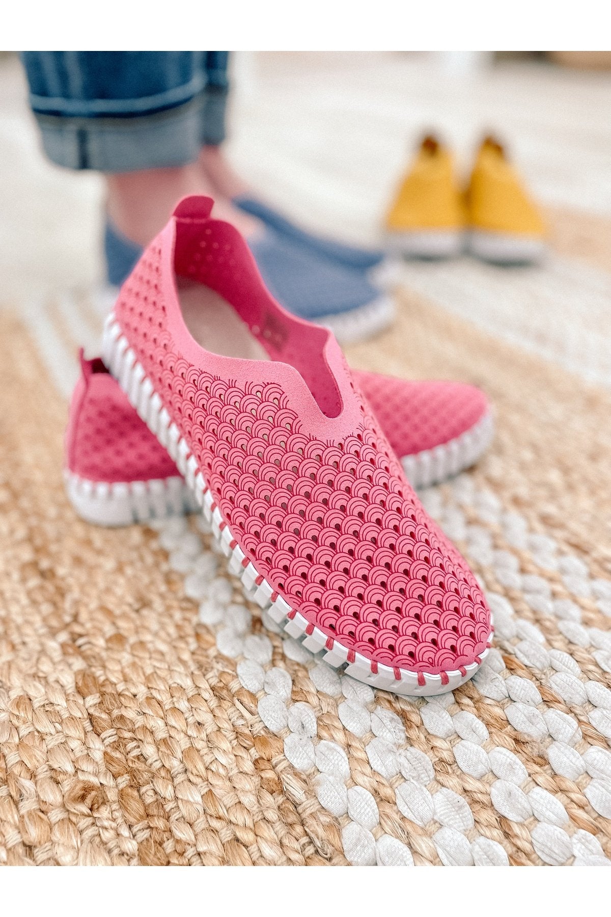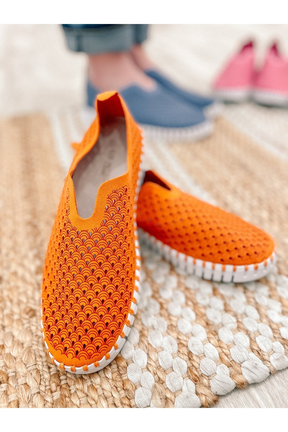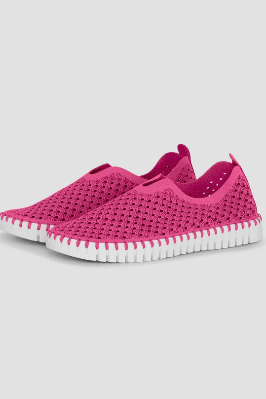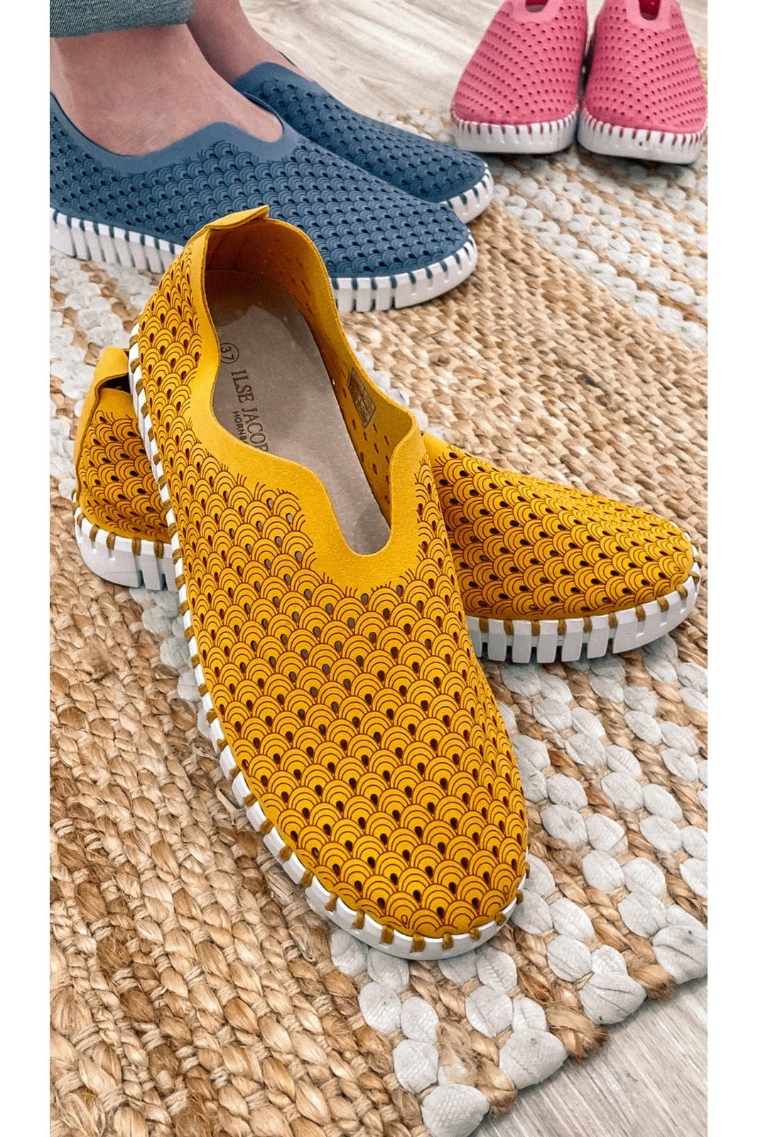 Iconic light weight Tulip shoe by Ilse Jacobsen. The upper is made of recycled microfiber and nicely decorated with a laser cut pattern. The upper construction is made without any glue as it is attached to the outsole, using recycled thread. The insole has padding and support, ensuring great comfort.