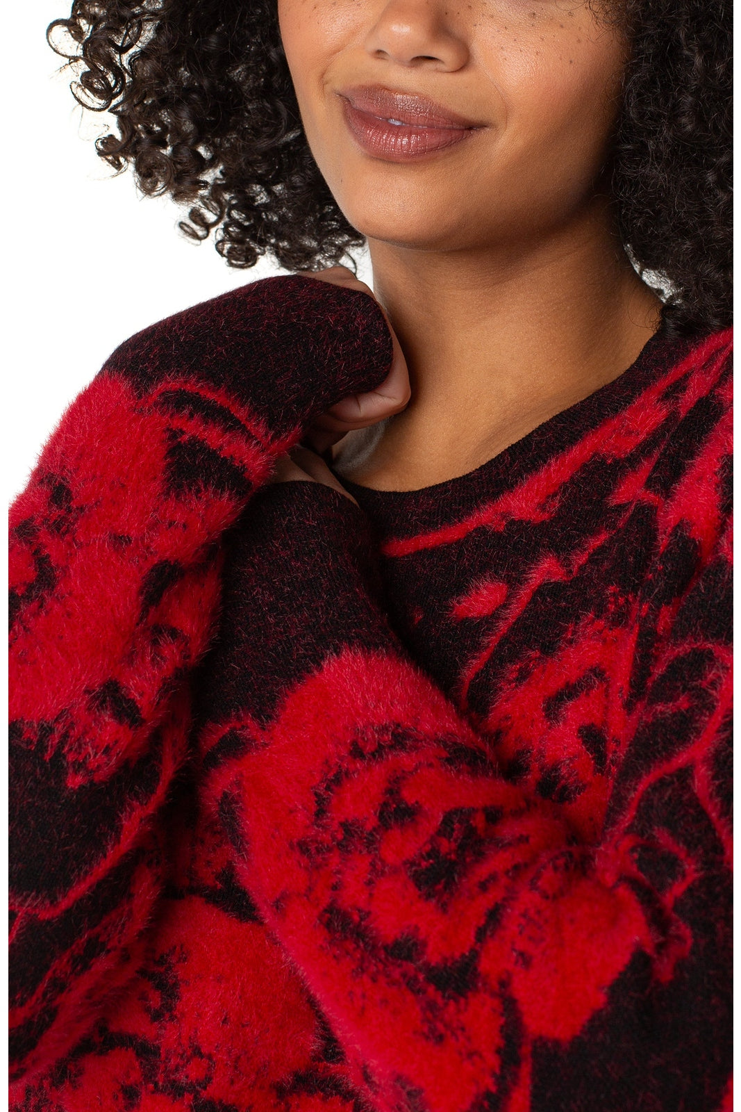 This is a long sleeve crew neck sweater in a black & red floral pattern.