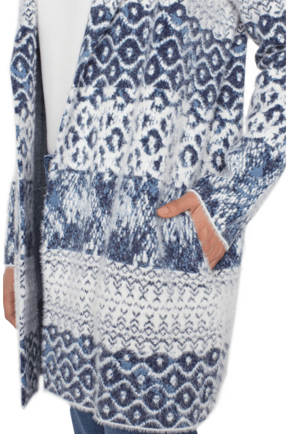 In a navy shibori print, this open-front coatigan is the perfect balance of structure and comfort. Designed with a double notch collar and clean seam pockets, it drapes effortlessly over knits, denim, or tailored layers—your go-to for cozy, pulled-together days.