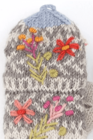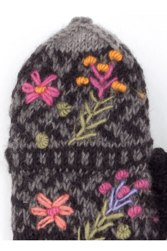 These charming fingerless mittens are a cozy celebration of craftsmanship and comfort. Featuring a soft fair isle knit accented with hand-embroidered wildflowers, the Sadie Finger Mittens bring a playful and feminine touch to cold-weather wear. The open finger design keeps hands toasty while allowing freedom to text, type, or sip your coffee. Lined with warm fleece and finished with a scalloped crochet edge, they’re the perfect match to the Sadie Beanie.