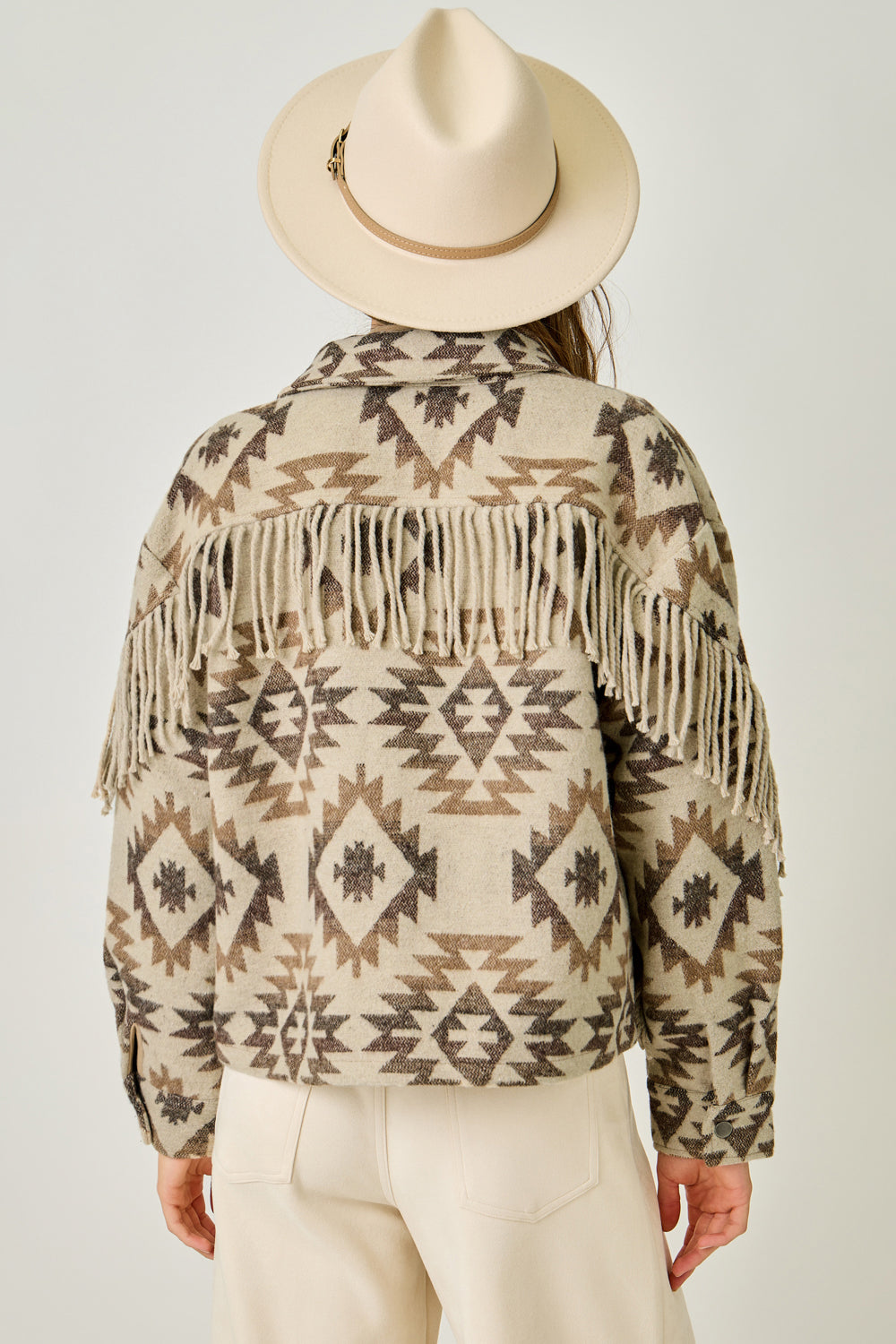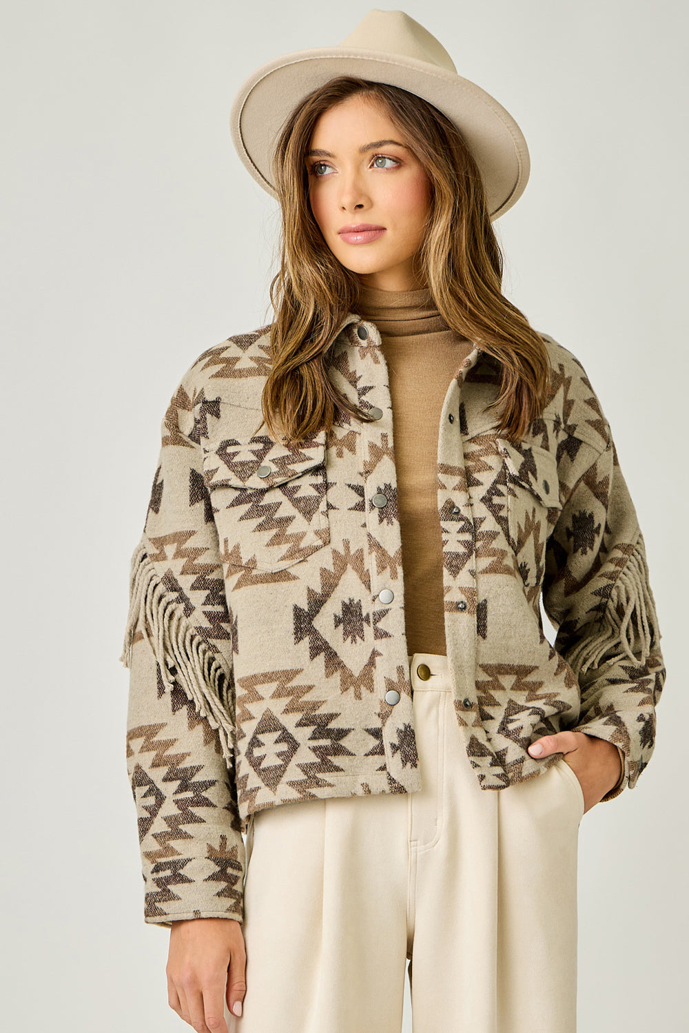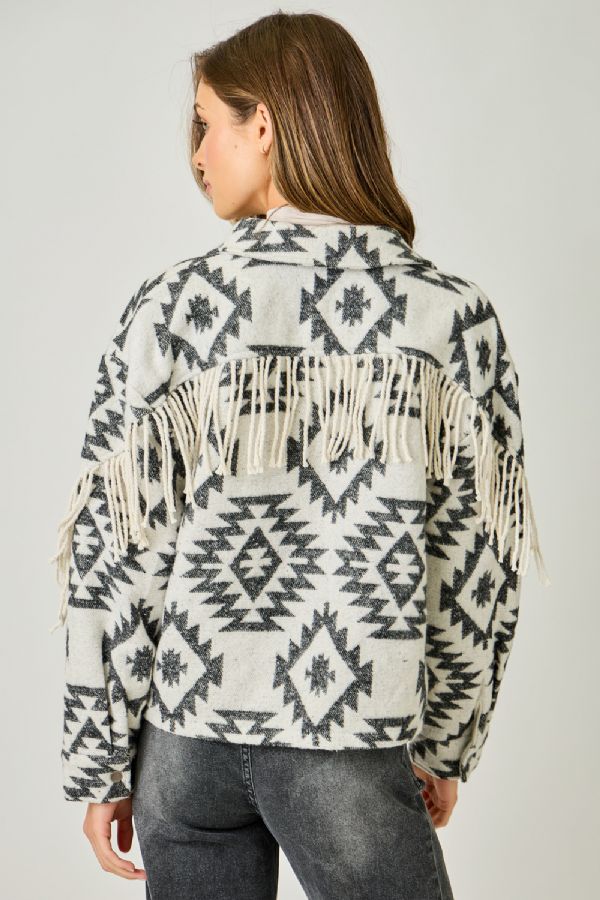 A bold statement piece with Western-inspired fringe and an easy button-down fit—designed for layering with style.