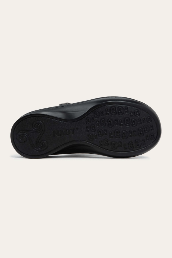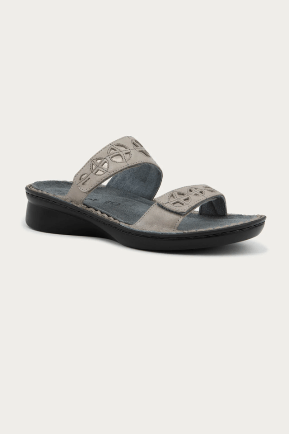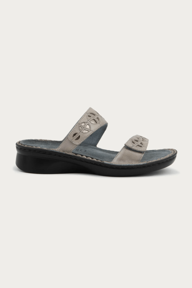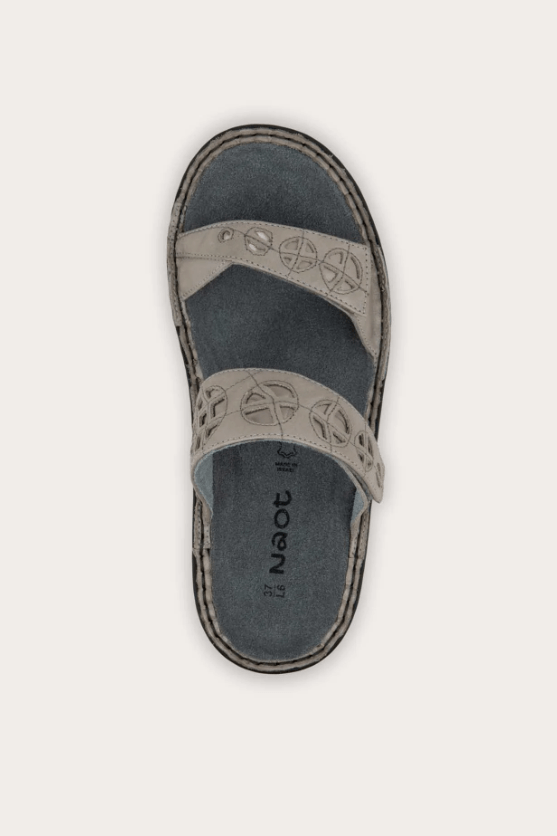 The Cornet is a chic slide sandal with stitch designs and contrasting polyurethane underlay. This style features a double hook and loop for complete adjustability. Naot's removable, anatomic cork and latex footbed is wrapped in pampering suede and molds to the shape of the foot with wear. The Allegro Collection features a 1.5" polyurethane sole which is extremely lightweight and durable. Our patented Naot Replacement Footbeds are also available for Cornet.