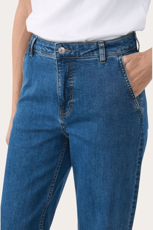 These high-waisted wide-leg jeans offer a cool and relaxed look. The wide legs create a flattering silhouette, while the classic denim ensures a timeless expression. Pair them with a simple T-shirt or shirt for an effortless everyday outfit.