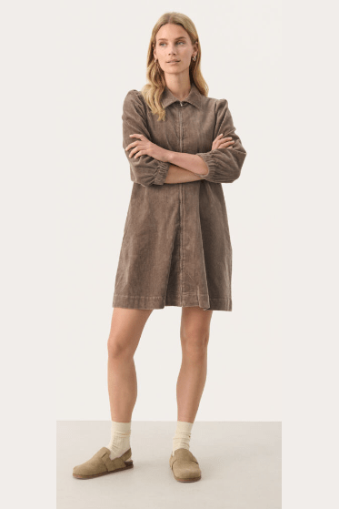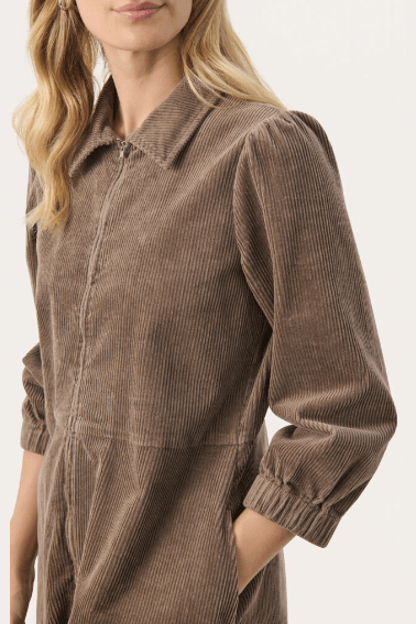Eyvor Corderoy Zip-Up Dress with 3/4 length sleeves is a comfy easy dress to Elevate your look this fall.