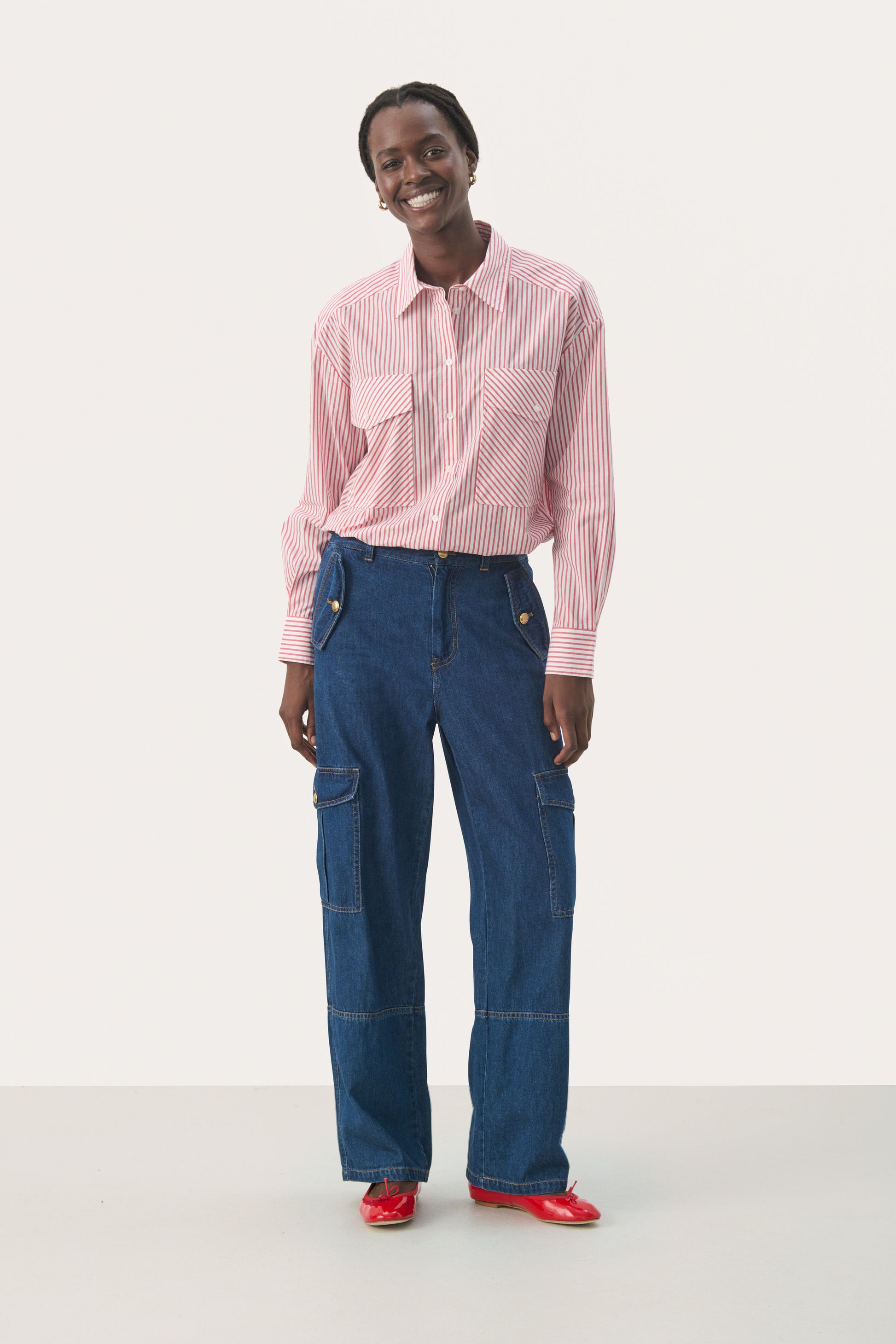 These cargo-inspired jeans in dark denim combine functionality and style with large side pockets and a relaxed, straight fit. Perfect for both everyday wear and casual outings where comfort is key. Style them with a simple T-shirt and sneakers for a cool, laid-back look.