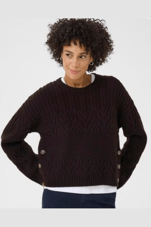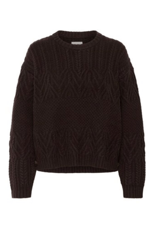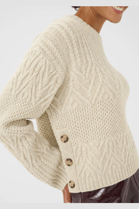 The Part Two Sindy Pullover Wool Sweater combines a classic cable knit look with stylish side button details. Made from soft wool, it offers warmth and a unique touch, perfect for adding cozy sophistication to your wardrobe.