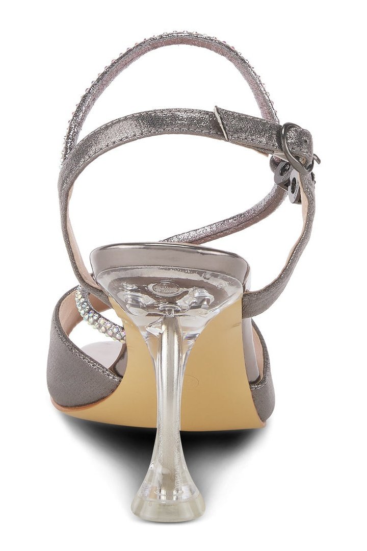 Elegant open-toe back strap pump featuring dazzling light charcoal and AB crystals on a unique sculpted clear heel and comfort sole.