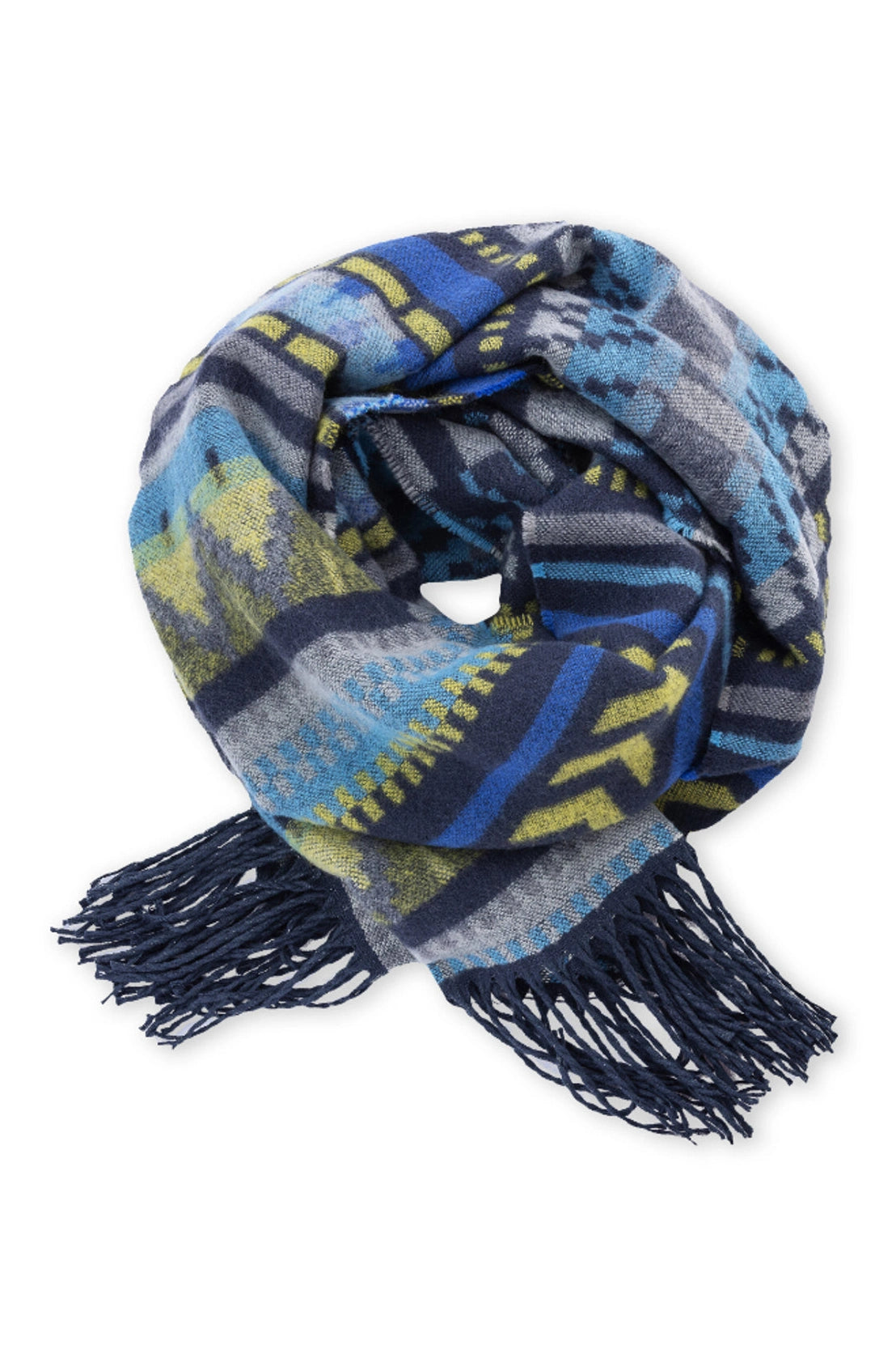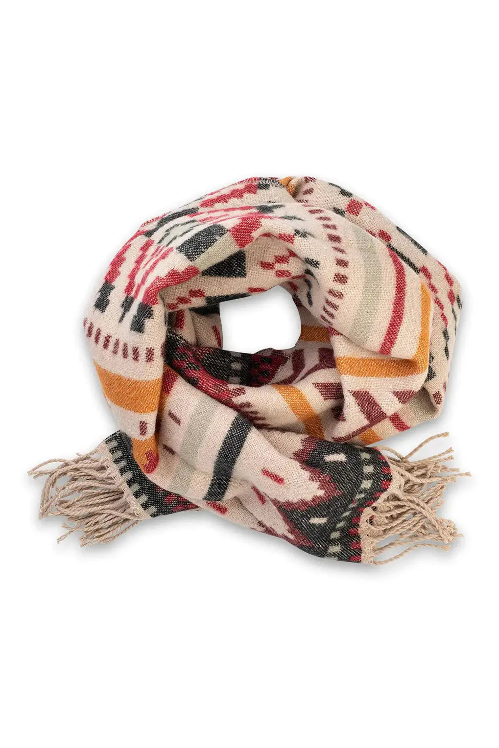 The Bray is a soft, blanket-like scarf that's easy to wrap. This women's scarf has a geometric print and natural, earthy colors that beckon cool weather. It's made of acrylic yarn and has fringed ends that give it a fun look.