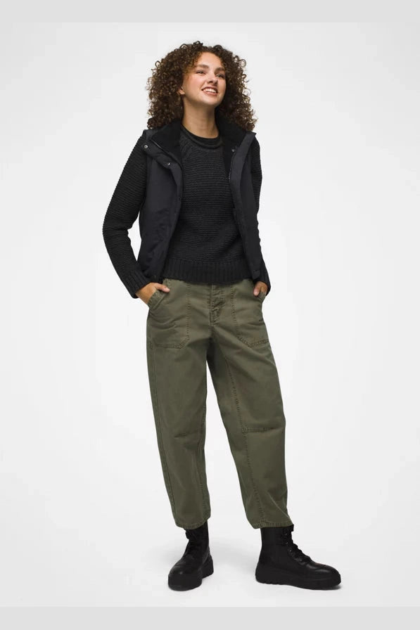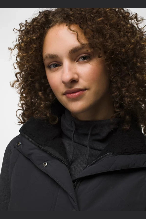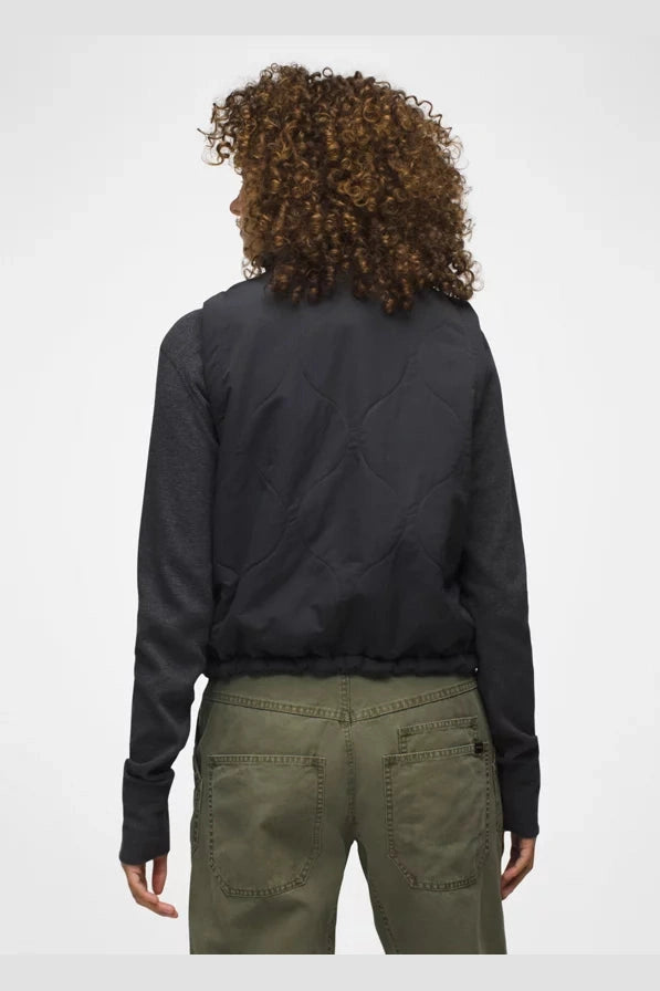 bluesign ® approved fabric • Recycled nylon woven shell with PFAS Free DWR (durable water repellent) insulated quilting with polyester sherpa fleece lining • Mixed materials with nylon and sherpa interior • Quilted vest with high collar • Center front zipper and snap closure • Welted side pockets with zipper closure • Bottom Hem drawcord adjuster • prAna flag label at wearers left hand pocket welt • Dimensions: CB Length: 21 1/2'