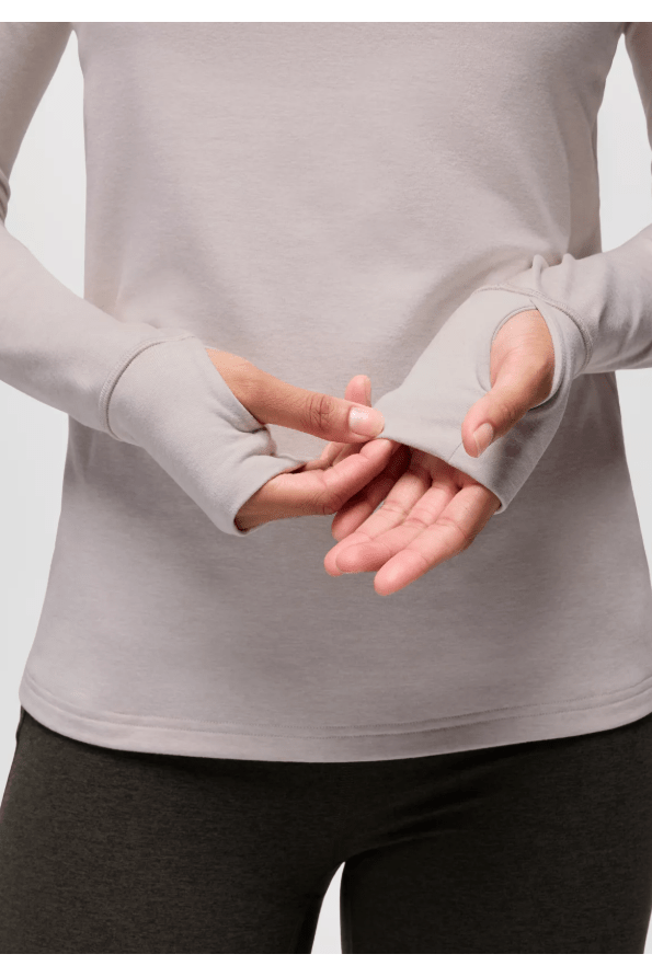bluesign ® approved fabric • Recycled polyester blend winter jersey with cozy brushed interior • Turtle neck long sleeve • One layer collar with gathered center back seam detail • Wide sleeve cuffs with overlap seam thumbhole • Concealed zip center back pocket • Flatlock construction • prAna embroidered logo placed at center back • Fitted