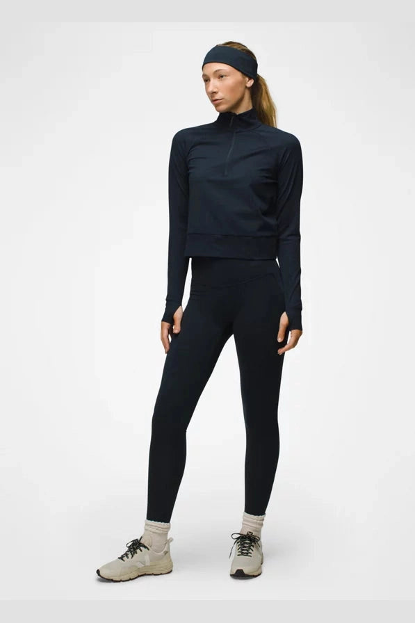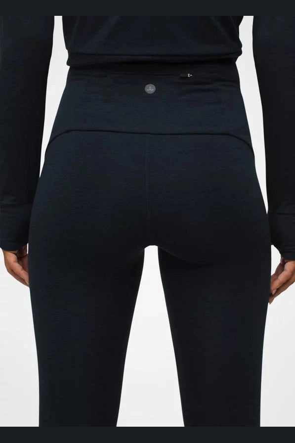 bluesign ® approved fabric • Recycled polyester blend winter jersey with cozy brushed interior • High rise legging • Triangle Coolmax (r) gusset for added comfort and reinforcement • Back yoke with concealed zip center back pocket • Flatlock construction • prAna reflective heat transfer placed at center back • Size: S / Inseam: 28' (71.12 cm)