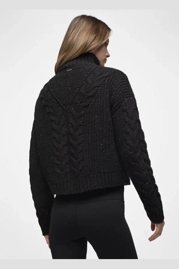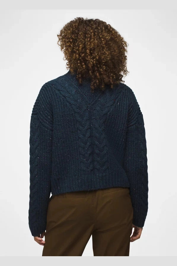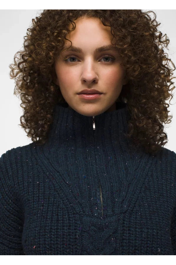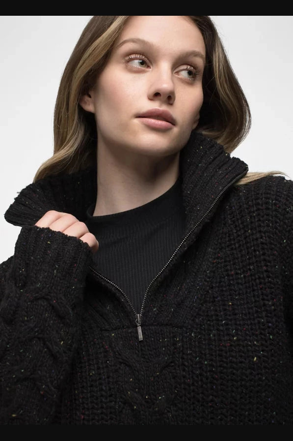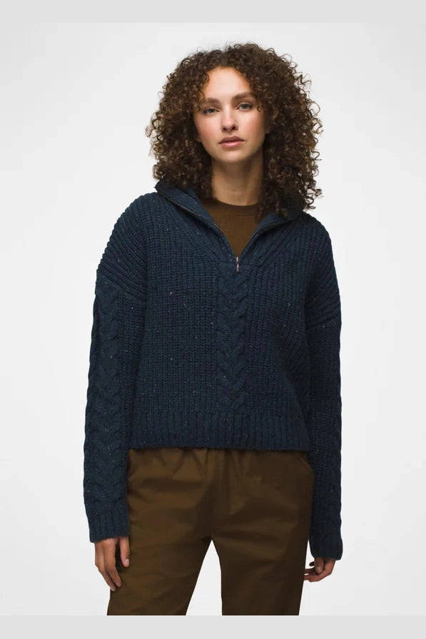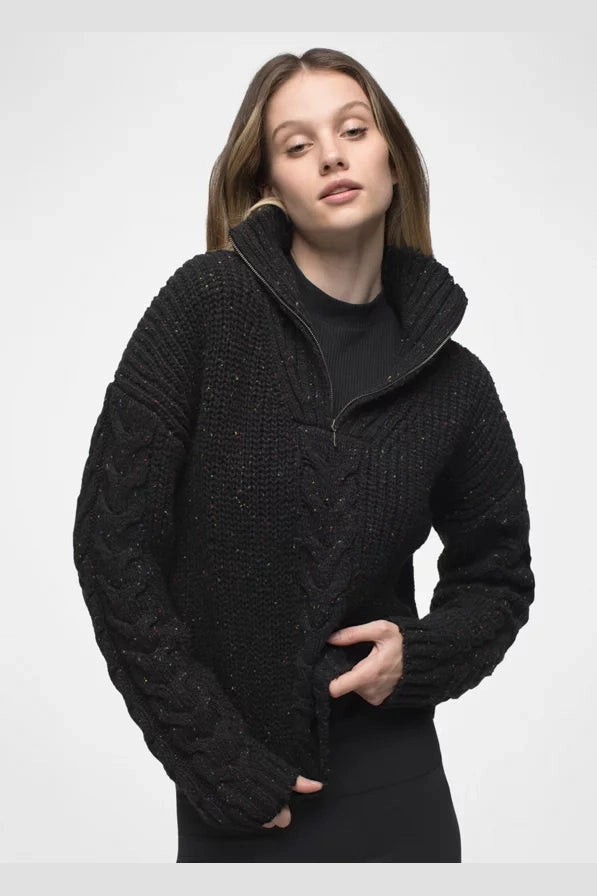 Recycled polyester; Responsibly sourced Wool; Recycled silk neps • Quarter zip neck • Cable knit styling on front, sleeves, back • Metal bar logo on back neck • Standard Fit