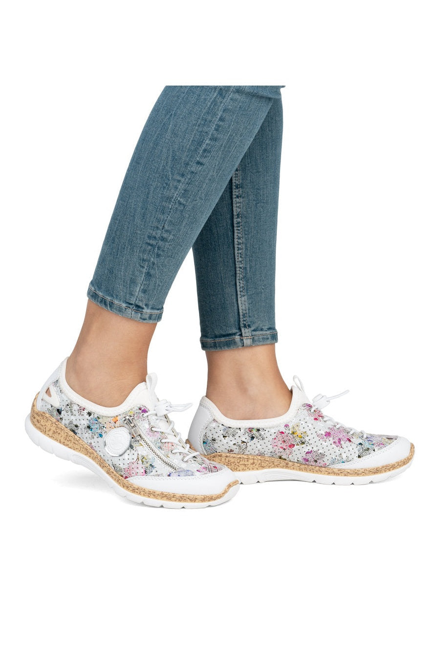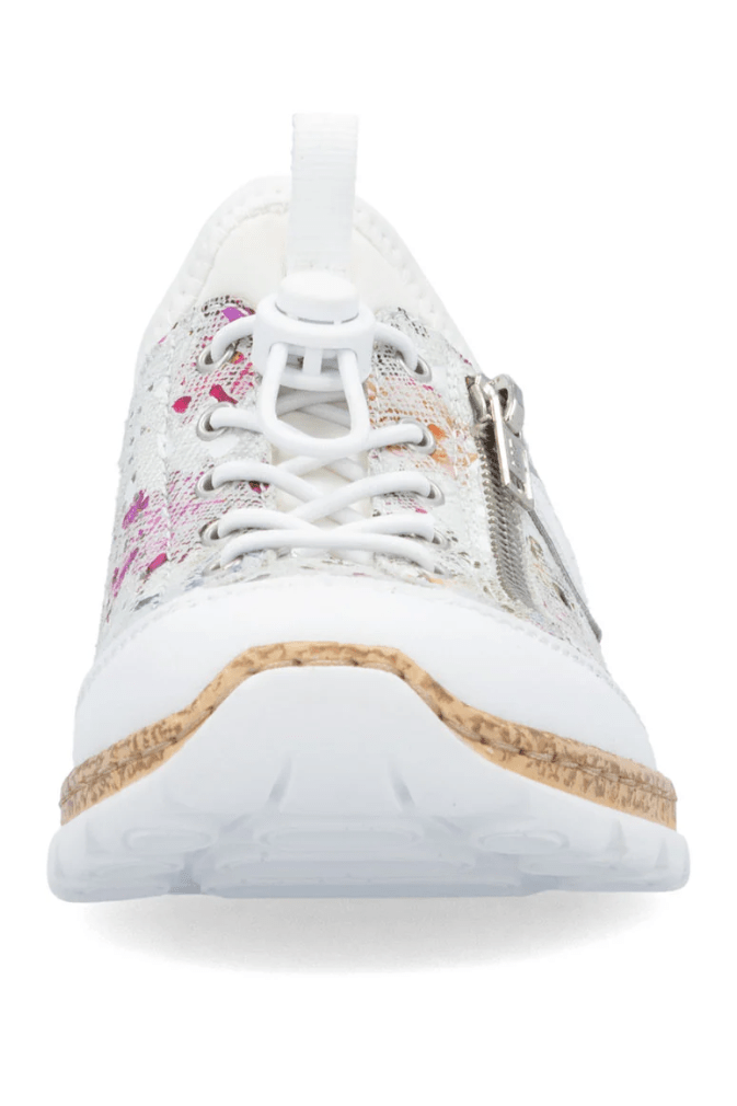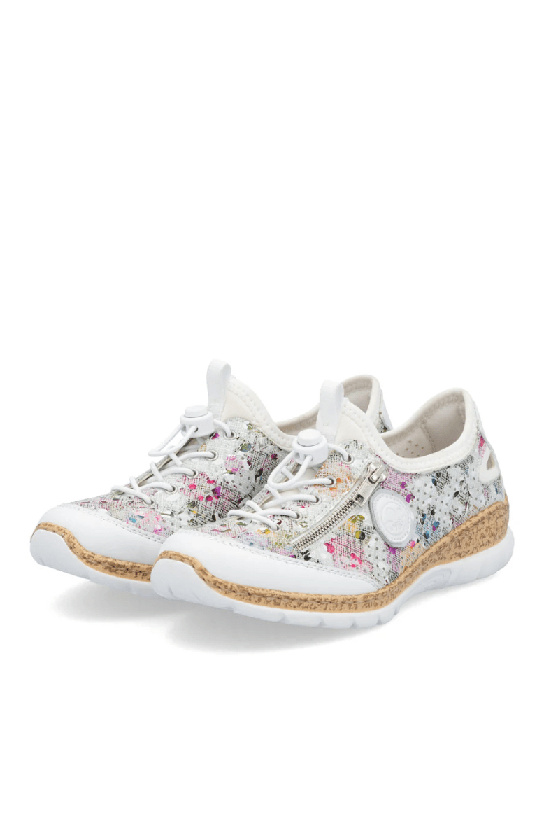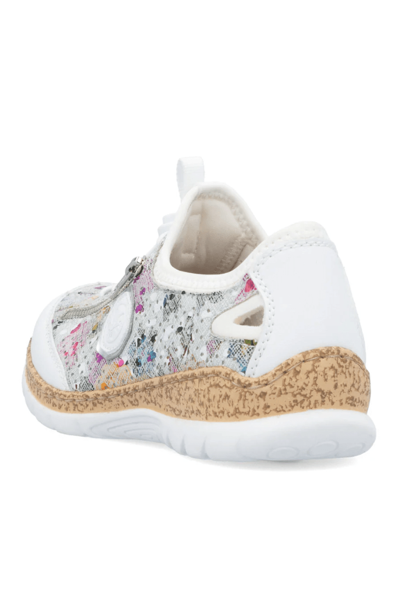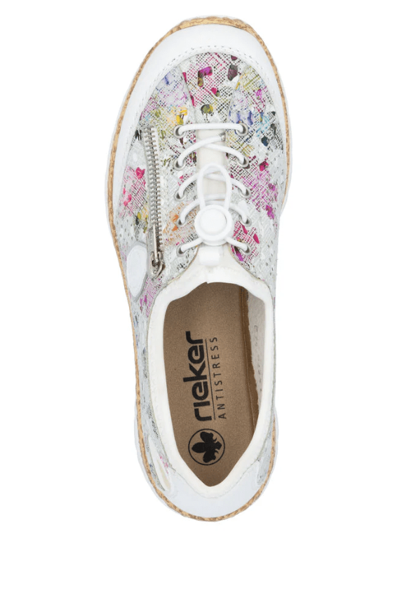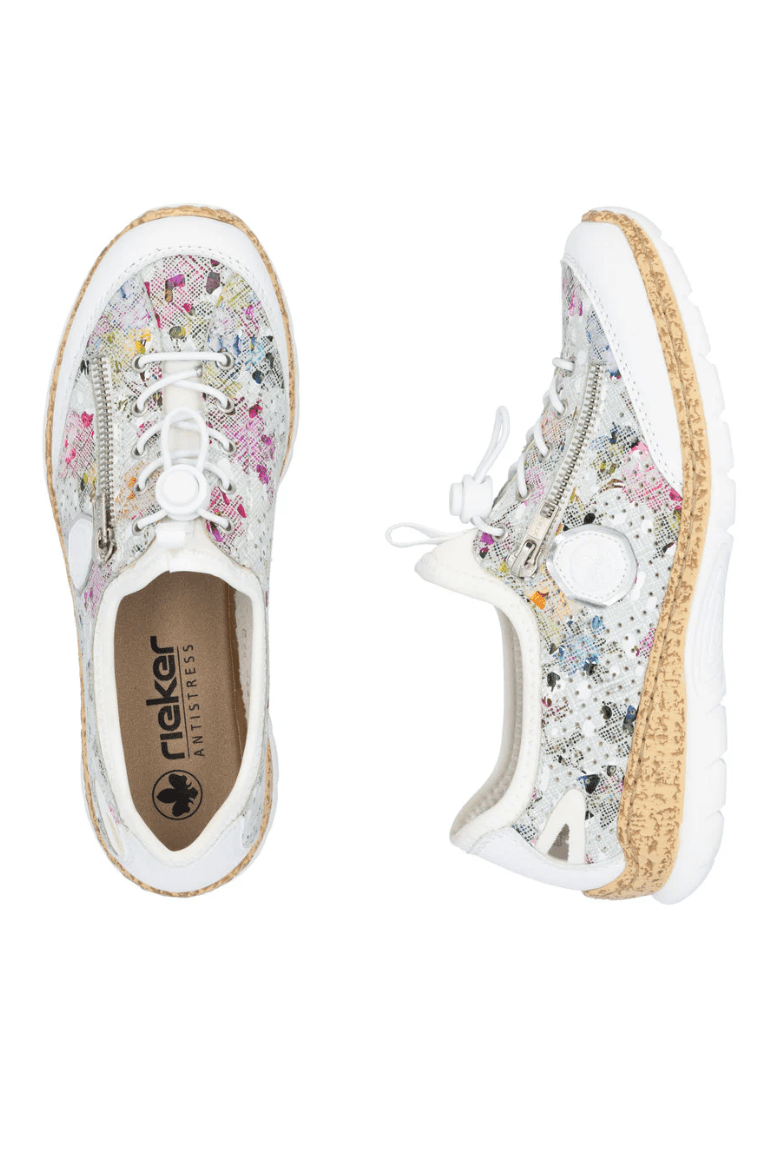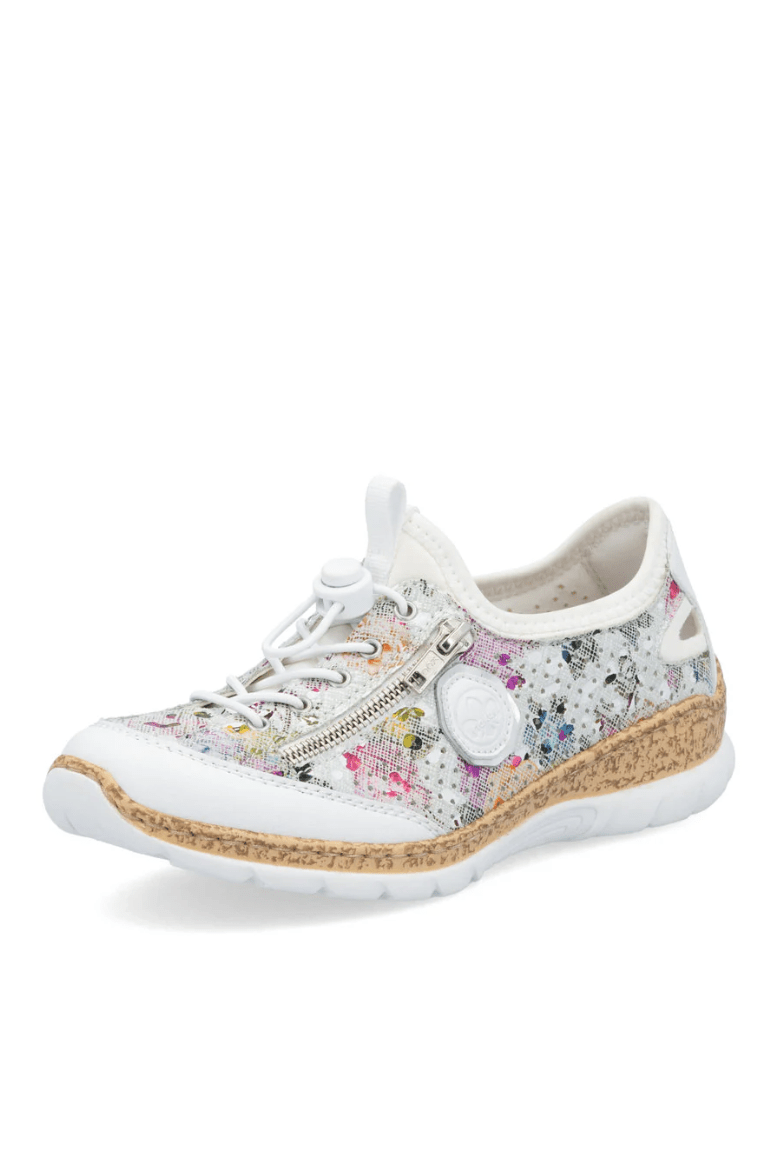 Attention, trend alert! These multi-coloured Rieker slippers combine style and comfort perfectly. This shoe was made using the traditional stitchdown technique, which provides excellent robustness and flexibility. Thanks to the elastic band and the elastic lacing, putting on this shoe is child's play. The decorative zipper harmoniously rounds off the look of the shoe. The light, shock-absorbing sole with wedge heel provides comfort with every step. Another plus is the extra soft MemoSoft cover sole. Bring on the next adventure!